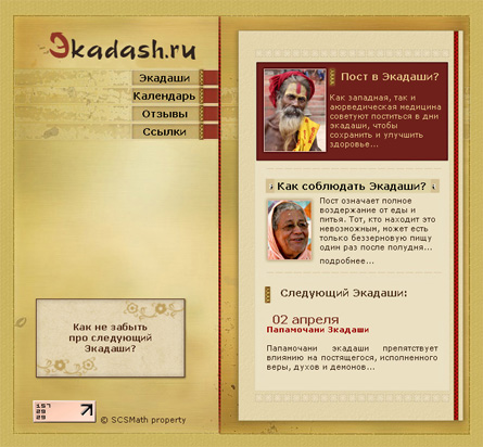 Открылся сайт про Экадаши18.03.2008 Зарегистрируйтесь на сайте ekadash.ru и Вы никогда не забудете про Экадаши! За день до Экадаши Вам вышлют письмо по электронной почте с напоминанием. А также на сайт есть информацию по каждому Экадашу.